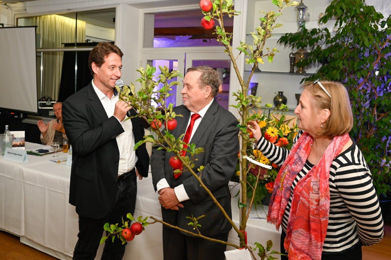 Mike Homann,und Berit Blümel überreichten ein Apfelbaum.