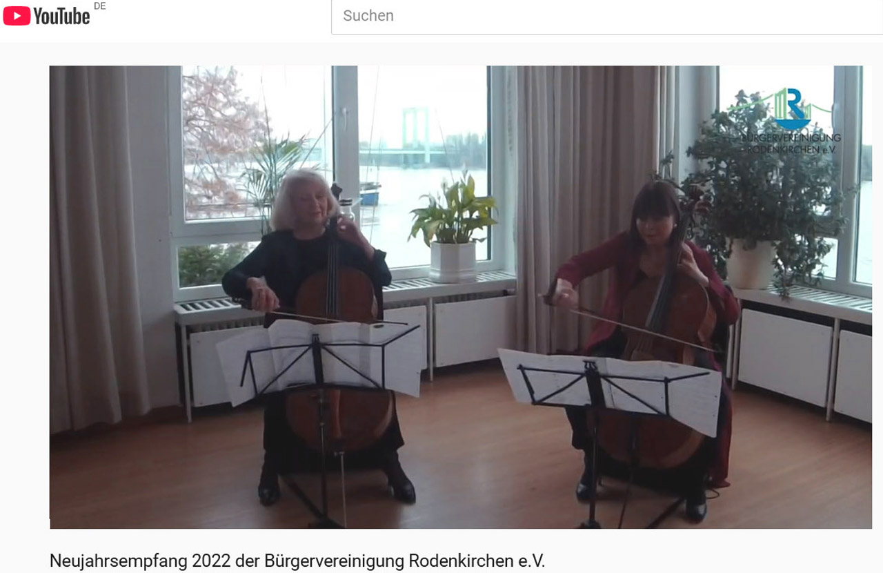 Musikalisch passend zur karnevalistischen 5. Jahreszeit wird der Video-Neujahrsempfang 2022 eingerahmt von einem virtuosen Tango-Stück von „Violoncello à deux“. Es spielen die Cellistinnen Uta Schlichtig und Birgit Heinemann aus dem Kölner Süden „La Cumparsita“ (auf Spanisch „kleiner Straßenumzug“).
