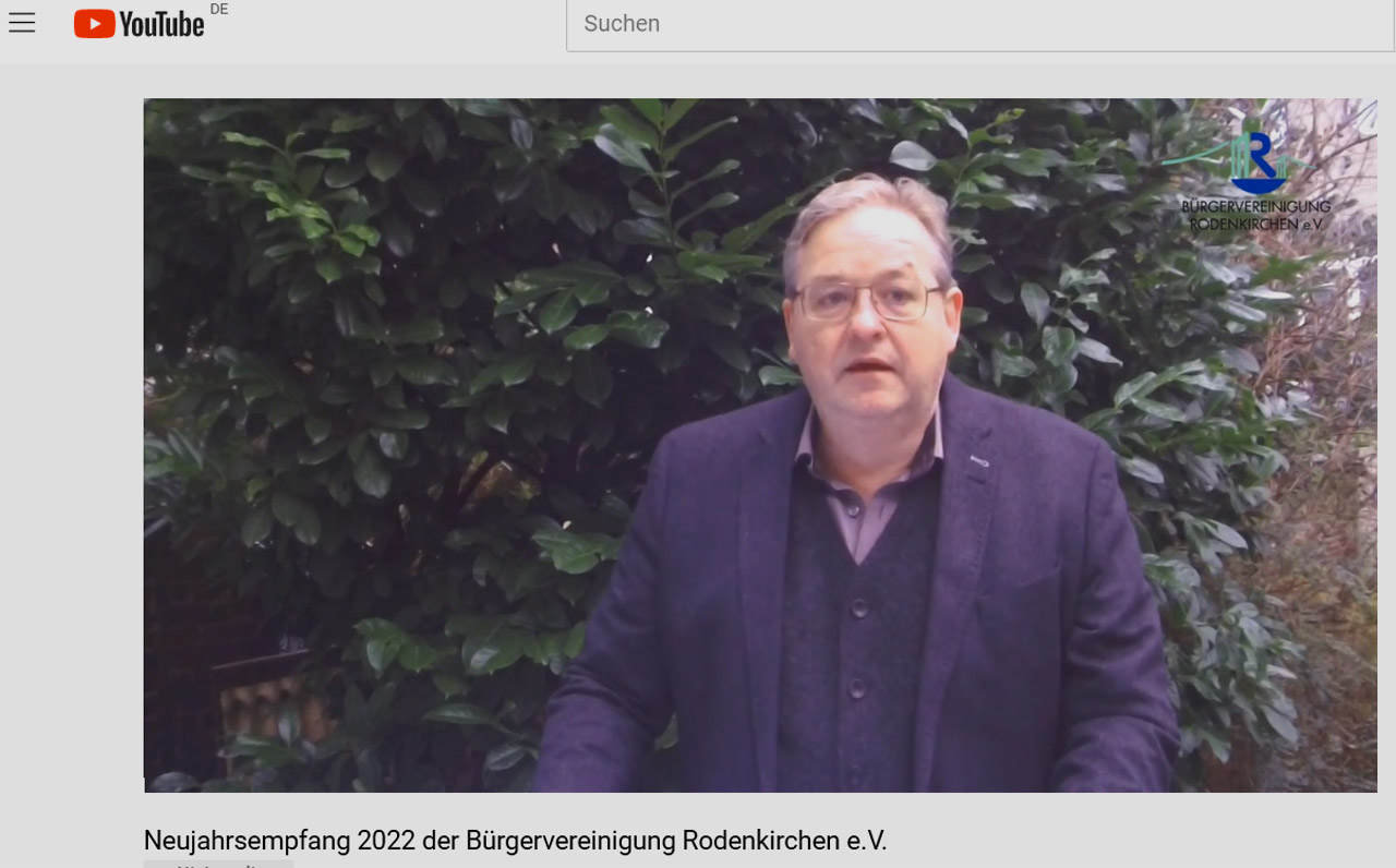 Im Video-Neujahrsempfang 2022 berichtet Wolfgang Behrendt, 1. Vorsitzender der Bürgervereinigung Rodenkirchen, zuerst über die aktuellen Tätigkeiten des Vereins. Er stellt die einzelnen Vorstandsmitglieder mit ihren Aufgaben vor.
