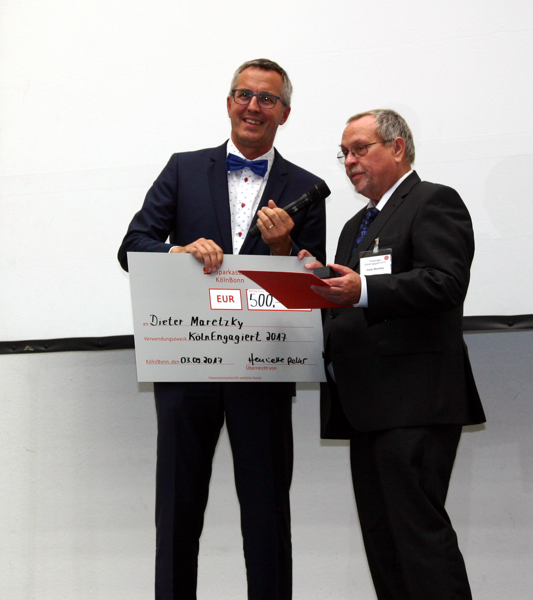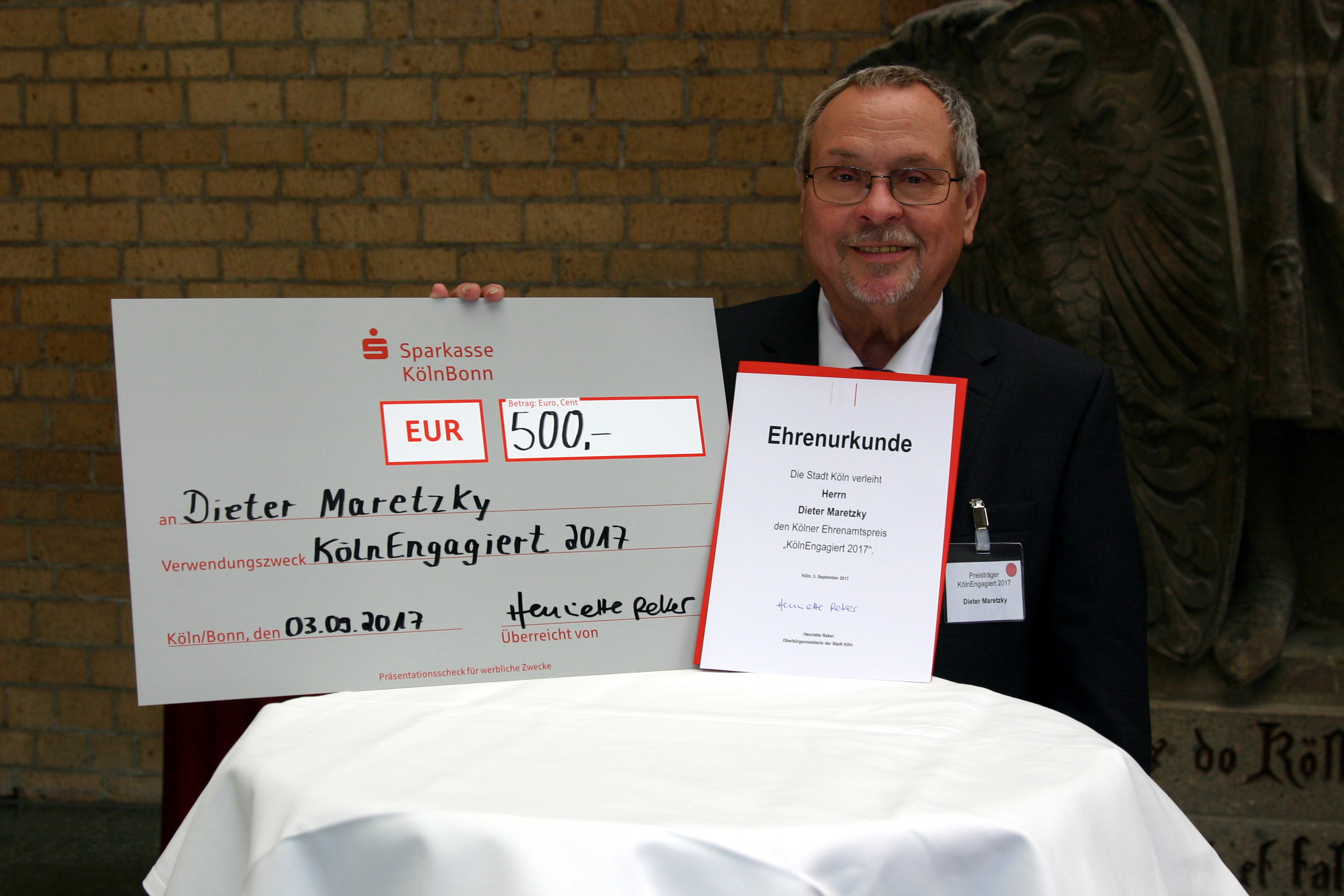 Dieter Maretzky erhielt aus der Hand von Bürgermeister Andreas Wolter den Ehrenamtspreis als Einzelperson für seinen jahrzehntelangen Einsatz für den Ort Rodenkirchen und den Kölner Süden. Das Preisgeld über 500 Euro möchte er zur Verschönerung der Blumenbeete in Rodenkirchen nutzen. Die Beete werden seit über zehn Jahren von der Bürgervereinigung Rodenkirchen bepflanzt und gepflegt.